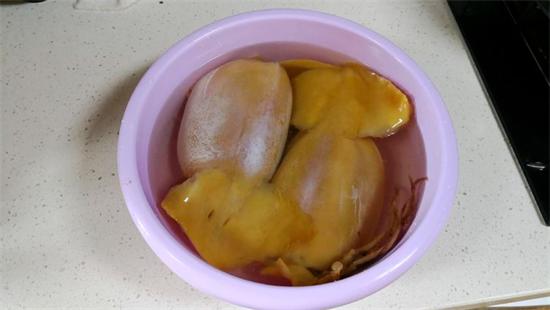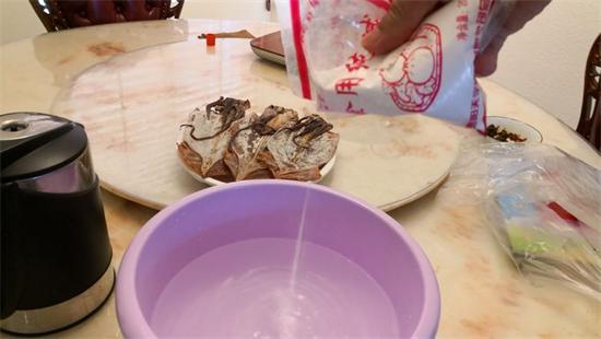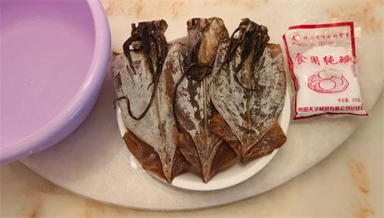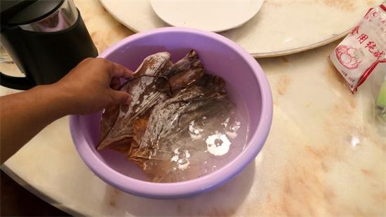 3、將干魷魚放入堿水中侵泡24小時(shí),中途不換水。