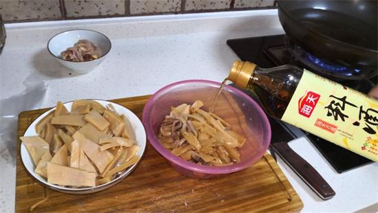 7、在切好的魷魚里倒入料酒,腌制10分鐘去腥。