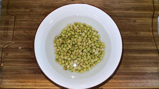 9、準(zhǔn)備半碗黃豆,用清水侵泡1小時(shí),備用。(本地黃豆,非轉(zhuǎn)基因。美國(guó)進(jìn)口的是轉(zhuǎn)基因的,請(qǐng)勿食用)。