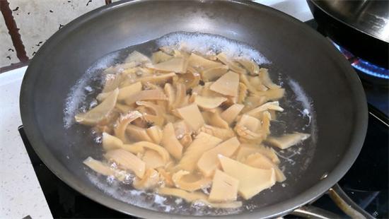 8、鍋里加水燒開、將切好的魷魚倒入鍋里,撩開水后撈出備用。
