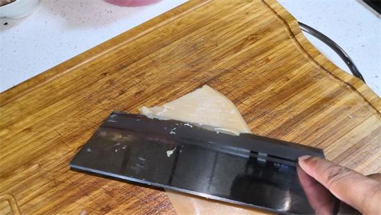 6、將泡好的魷魚按45度角切斜刀打花、切段備用。