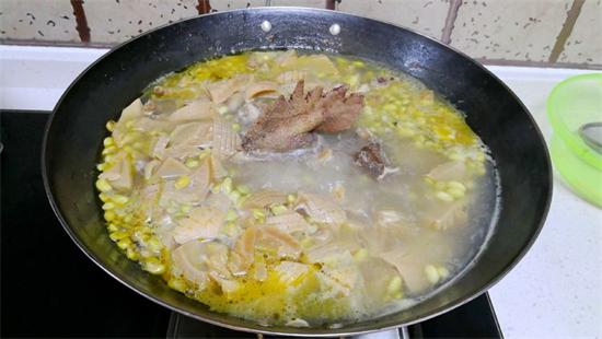11、將雞與黃豆加冷水燉上半小時(shí),加生姜、少許鹽。