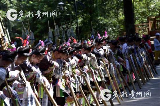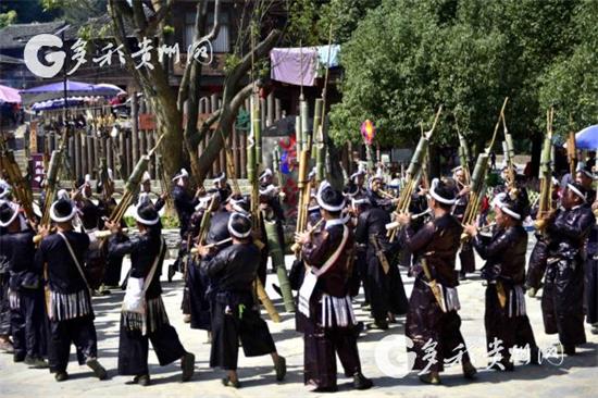 2018年10月1日,在從江縣岜沙苗寨,當地苗族村民在表演蘆笙合奏曲(吳德軍 攝)