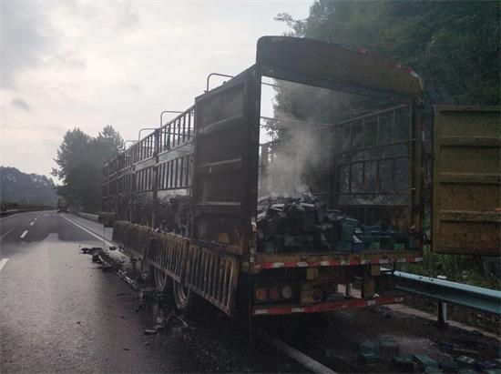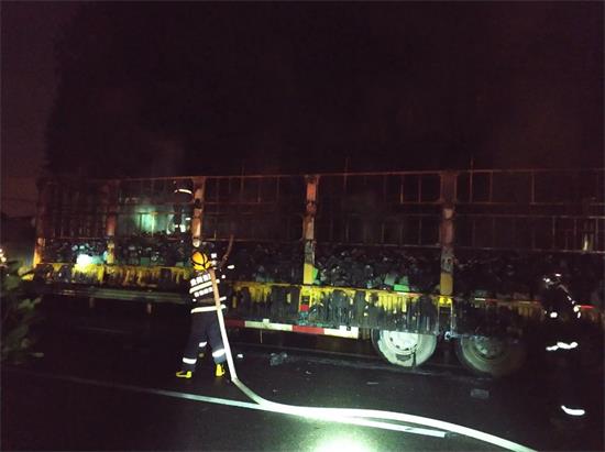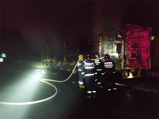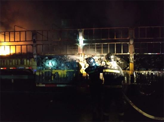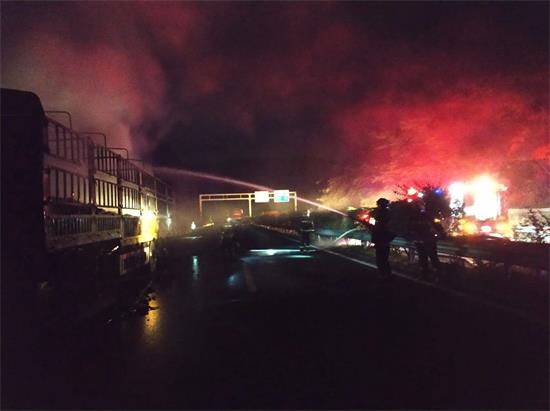 消防官兵到達現場,立即對起火車輛進行了偵查,此時,烈火早已包裹整個貨車,濃煙滾滾,電瓶燃燒發出刺鼻的氣味,偶爾發出微弱的爆炸聲。消防官兵立即使用兩支水槍進行滅火,經過近三十分鐘的撲救,成功將大火熄滅,在確認無復燃的情況下,消防部門將現場移交高速交警。