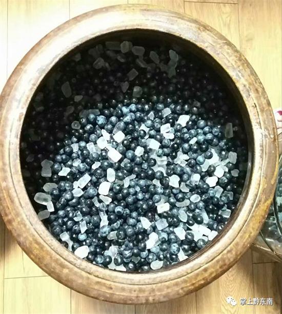 4、裝藍莓。一種是直接把無水分的藍莓全部裝進密封罐里,密封好,等待發酵。另一種是準備些冰糖,在瓶子里放一層藍莓,撒一層冰糖,冰糖與藍莓的比例是1:10或者3:10(10斤藍莓,一斤或三斤冰糖)以此類推(小編用了一些酒曲酵母,農貿市場有售)。
