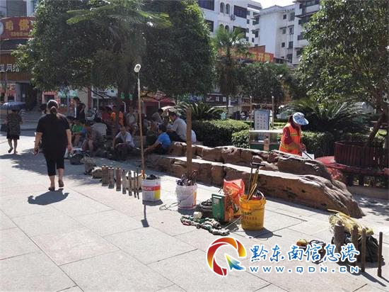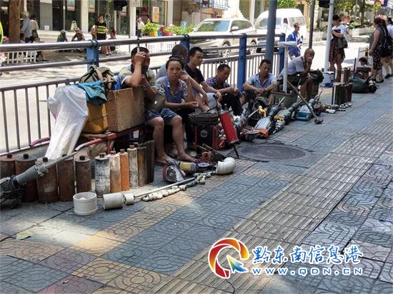 記不得從什么時(shí)候起,凱里市區(qū)突然出現(xiàn)了這么一群人,每天早晨就站在街邊,等著別人來找他們干活。他們中有男有女,有老有少,有的面前還擺放著一排各式各樣的工具,有的只是一根扁擔(dān)、幾個(gè)麻布口袋。剛開始,這些等工師傅分布在凱里的各個(gè)地方,后來,這個(gè)隊(duì)伍越來越壯大,凱里市有關(guān)部門干脆在營(yíng)盤坡路口和瑞祥路口設(shè)立了臨時(shí)等工點(diǎn),等工師傅們也算是有了落腳點(diǎn),每天都在這兩個(gè)地方等活。