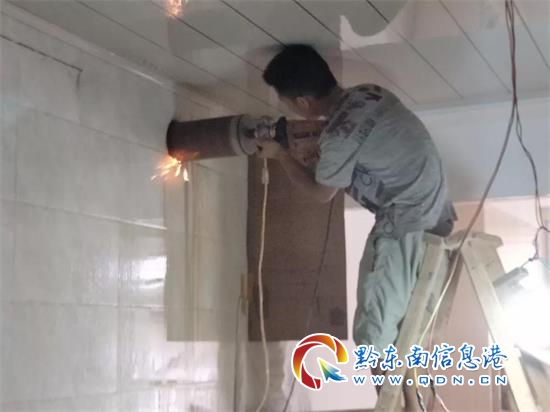 雇主告訴他,要在這面墻的右上方的位置打一個(gè)油煙機(jī)排煙管的孔,雇主做好墻面保護(hù)措施后為他架好樓梯,小龍?jiān)阢@機(jī)上裝好水鉆頭,確保連接水鉆頭的注水桶里水量充足等打孔的前期準(zhǔn)備工作。