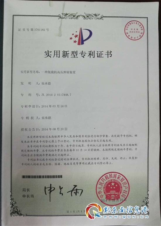 2014年3月份,張老師研究的“航母艦載機高壓彈射裝置”申請了專利,并于同年8月份給他頒發了專利證書。