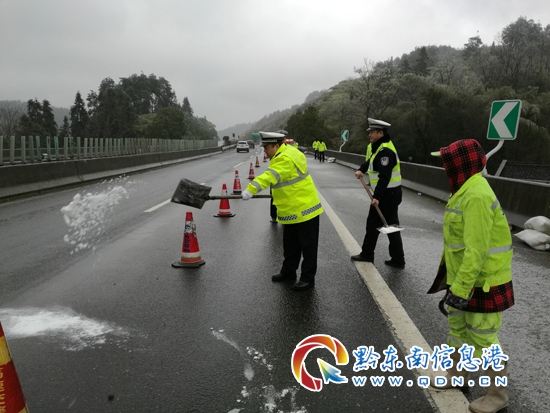 在采取渠化路面措施的同時黔東南州交警支隊高速四大隊聯合轄區高速路政、高速應急等高速公路救援單位采取錯時巡邏的方式24小時不間斷監控路面通行情況、危險路段溫度計情況,通過這樣的方式實時了解路面凝凍情況以及天氣變化情況及時采取預防性壓道撒鹽的方式防止路面結冰。