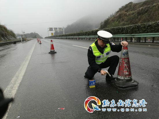 1月24日根據天氣預報未來幾天黔東南州交警支隊高速四大隊轄區將有大幅度降溫,為預防凝凍天氣造成的路面結冰濕滑引起的道路交通事故。黔東南州交警支隊高速四大隊領導王開平大隊長、石堅隊長、耿禹指導員帶頭在轄區危險路段、易凝凍路段采取了用反光三角錐桶渠化路面將公路壓縮成只有快速車道能通行,強制過往這些路段的車輛提前降速行駛,有效防止事故的發生。
