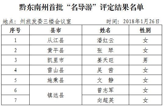 根據州委、州政府“三名工程”有關工作要求,為樹立我州導游典型,展示“大美黔東南”良好旅游品牌形象,推動旅游產業經濟快速發展,在州委組織部的統籌安排下,黔東南州旅發委組織我州相關專家,秉承公平、公正、公開、競爭、擇優的原則,對各縣市推薦的優秀導游進行了現場綜合評審,評出了黔東南州首批“名導游”7人。按照評選方案,現對7位“名導游”人員進行公示,時間為五天,公示期間,若有對評定結果有影響的情況,歡迎進行電話、信函舉報,我們將對舉報事項進行調查、核實,提出處理意見,并保護舉報人的隱私。