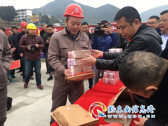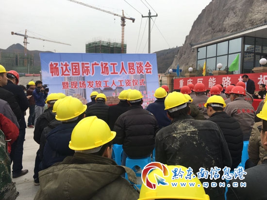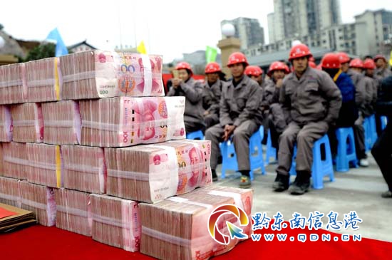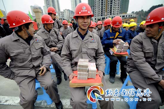 本網訊 (記者 楊懿)2月6日,黔東南州重點文化旅游項目-大黔集項目現場盛況空前,來自500強企業中鐵十六局及重慶巨能集團的600多名農民工建設者們齊聚一堂,每個人臉上都洋溢著收獲幸福的喜悅,手里拿著豐厚的工資,喜滋滋的準備回家過年。