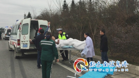 沒過多久,貴陽醫學院第二附屬醫院(凱里市四一八醫院)的轉運車輛就到達了現場,在民警的協助下,將因車禍受傷的男子,轉移到轉運車輛上,并指揮救護車安全離開現場。