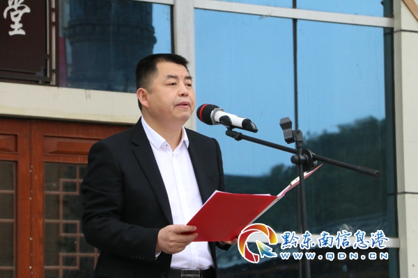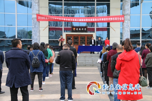 本網訊 (記者 田應龍)4月15日上午,2018年貴州省旅游行業千家企業萬名員工誠信經營優質服務公開承諾儀式黔東南分會場在凱里苗侗風情園舉行。州委宣傳部副部長、州文明辦主任文必武出席儀式,并發表講話;州旅發委黨組成員、副主任胡浩宇主持議式,州發改委、州工商局代表,以及各縣市旅發委,全州星級酒店、旅行社、旅游車隊等旅游企業代表參加了本次儀式。