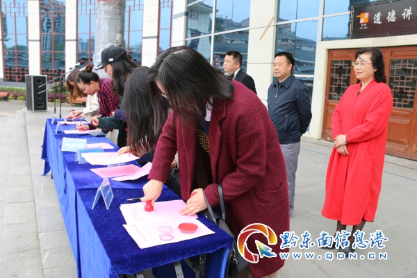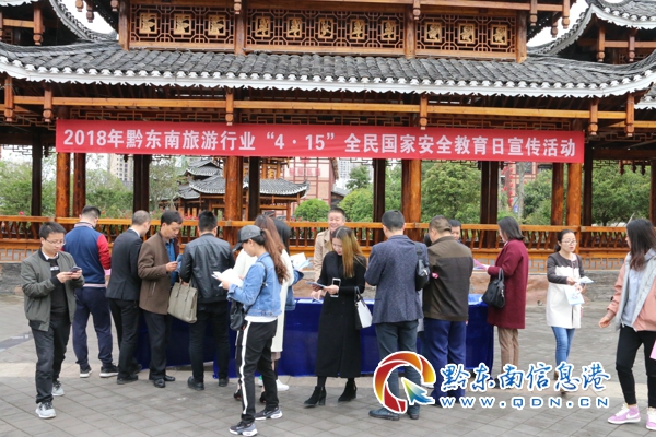 儀式現場,黔韻風情旅行社、苗妹非遺博物館、黔嶺汽車運輸公司、凱萊酒店、天籟之都大酒店等涉旅企業代表分別上臺簽訂誠信經營優質服務承諾書。承諾儀式結束后,各企業代表還參加了2018年黔東南旅游行業“4•15”全民國家安全教育日安全活動。