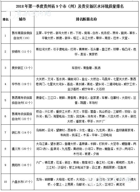 據悉,水環境質量排名是由貴州省環境保護廳對9個市(州)及貴安新區共153個監測斷面第一季度水質監測情況,按照《城市地表水環境質量排名技術規定》進行研究和核算而得。