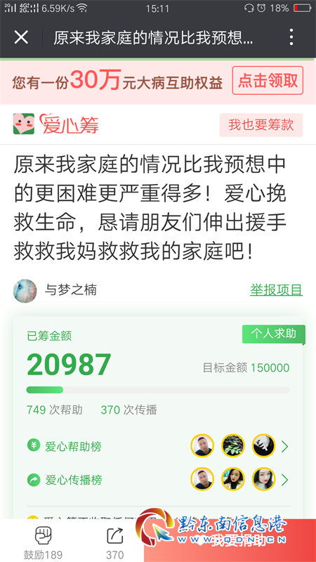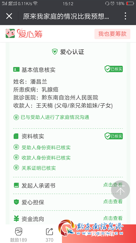 5月22日,一條“眾籌救母”的愛心籌信息出現在了凱里很多人的朋友圈,經記者調查核實得知,該信息為青島科技大學自動化學院的一名大四本科生王天楠發起的愛心籌,內容屬實,目的是為了幫助身患惡性腫瘤乳腺癌的媽媽籌集救命錢。