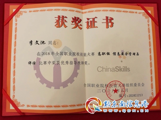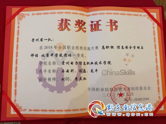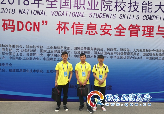 比賽中,貴州電子信息職業技術學院在指導教師劉昉、李文池及學生石云升、龍平、陳磊的團結協作下,勇奪2018年全國職業院校技能大賽高職組“移動互聯網應用軟件開發賽項”、“信息安全管理與評估賽項”兩個團體團體一等獎、“高職組云計算技術與應用賽項”三等獎;同組的貴州代表隊貴州航天職業技術學院、黔南民族職業技術學院、貴州輕工職業技術學院、貴州交通職業技術學院也在比賽中表現出色,拿下多個獎項。