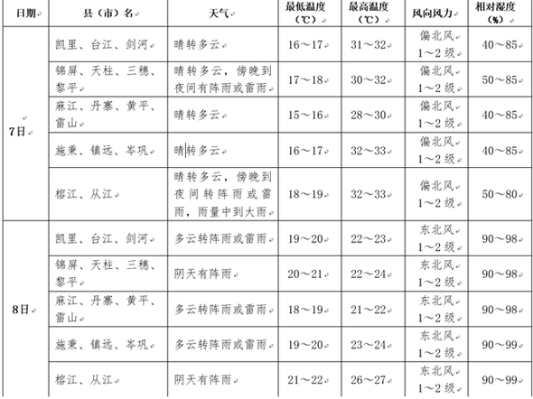 預計6日夜間到7日白天全州晴轉多云;7日傍晚到8日白天全州自東南向西北多云轉陣雨或雷陣雨,雨量小到中雨,清水江流域及以南地區部分鄉鎮有大雨,個別鄉鎮有暴雨,氣溫略有下降;8日夜間到9日全州陣雨轉多云,氣溫回升。