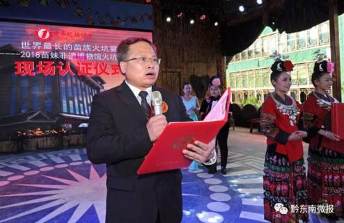2018年6月25日17:38分,這是一個(gè)記錄世界歷史的時(shí)刻,世界紀(jì)錄協(xié)會(huì)高級(jí)認(rèn)證官?gòu)埥∠壬x認(rèn)證詞:“2018年5月25日,中國(guó)貴州凱里開發(fā)區(qū)苗妹非遺博物館舉辦苗族火坑宴,該苗族火坑宴長(zhǎng)度為139.9米,創(chuàng)世界紀(jì)錄協(xié)會(huì)‘世界最長(zhǎng)火坑宴’世界紀(jì)錄。”