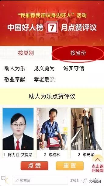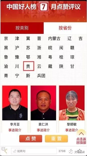 2、進入投票頁面后點擊選項“按省份”,進入省份頁面后選擇“貴”,下方人選刷新為貴州候選人,此時可進行投票。