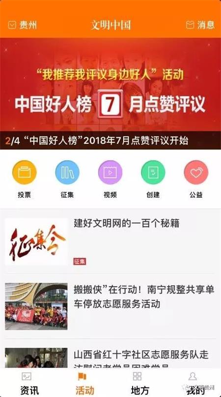 1、下載"文明中國"手機客戶端,進入"文明中國"手機客戶端,頁面下方選擇“活動”板塊,點擊“中國好人榜”7月點贊評議開始啦!