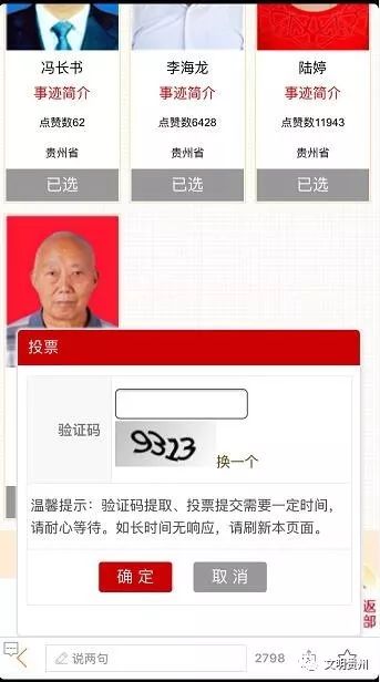 3、在相應候選人下方點擊“點贊”按鈕后顯示灰色按鈕“已選”后,必須再次點擊下方紅色按鈕“點贊”,點擊后頁面會出現投票“驗證碼”輸入框,根據提示輸入隨機驗證碼,點擊確定,出現投票成功頁面提示框后,本次投票完成結束。
