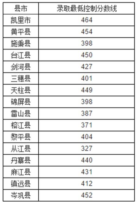 2018年黔東南州面向本縣市招生普通高中學校錄取最低控制線(按各縣市公辦學校總計劃劃線)分別為:凱里464分、黃平454分、施秉398分、臺江450分、劍河427分、三穗401分、天柱449分、錦屏398分、雷山387分、榕江371分、黎平404分、從江327分、丹寨440分、麻江431分、鎮遠412分、岑鞏452分。