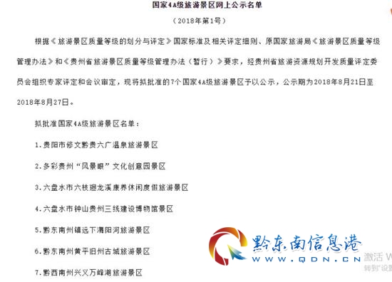 截止2018年4月27日,貴州省境內的國家4A級旅游景區(qū)有95家,最新一批7個4A級景區(qū)公示結束后,貴州省境內的國家4A級景區(qū)數(shù)將突破100個。本次公示期為2018年8月21日至2018年8月27日,具體信息可登陸貴州省旅游發(fā)展委員會官網(http://www.gztour.gov.cn/)查看。