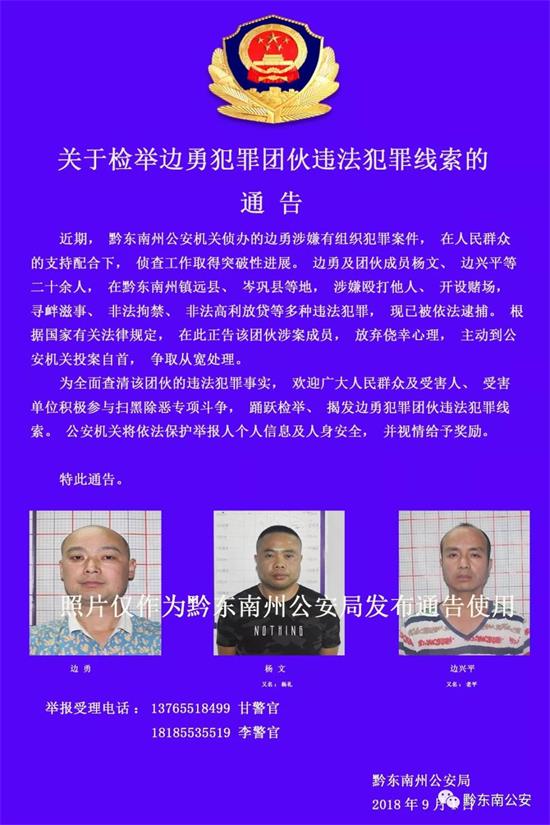 關于檢舉邊勇犯罪團伙違法犯罪線索的通告