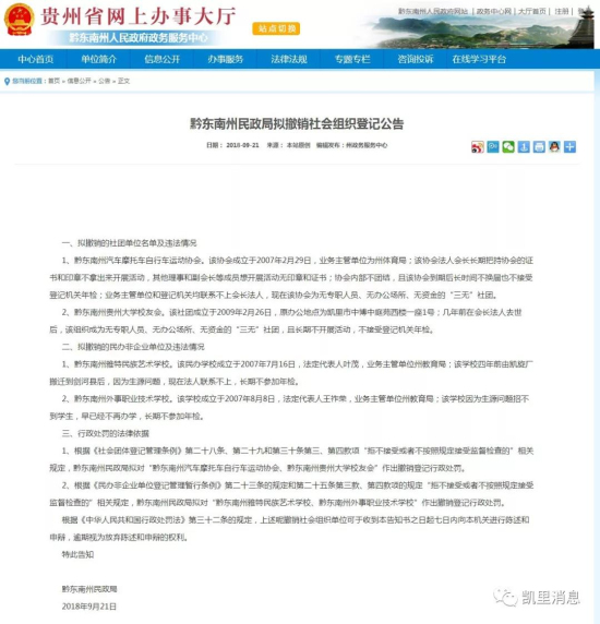 2、黔東南州貴州大學校友會。該社團成立于2009年2月26日,原辦公地點為凱里市中博中庭苑西樓一座1號;幾年前在會長法人去世后,該組織成為無專職人員、無辦公場所、無資金的“三無”社團,且長期不開展活動,不接受登記機關年檢。