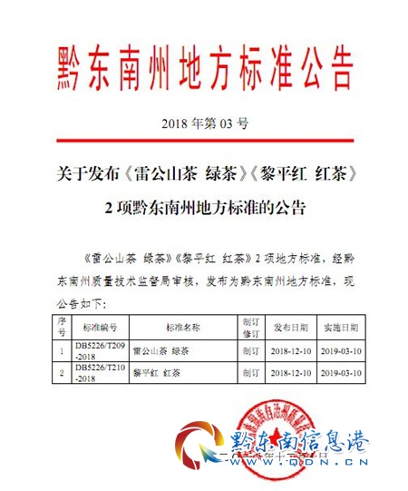 本網訊 (記者 王莉) 12月26日,黔東南州《雷公山茶 綠茶》、《黎平紅 紅茶》地方標準公共品牌新聞發布會在凱里市召開。這是新《標準化法》實施后,黔東南州第一次發布產品標準,也是黔東南州茶葉產品第一次制定的公共品牌標準。