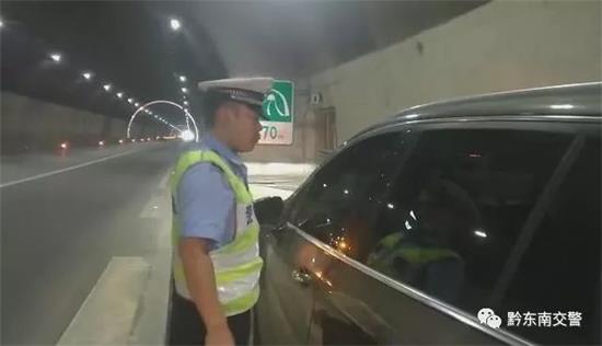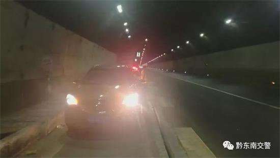 當(dāng)天下午3點(diǎn)半左右,黔東南州公安局交警支隊(duì)高速六大隊(duì)民警巡邏至廈蓉高速喬果山隧道時(shí),發(fā)現(xiàn)前方緊急停車(chē)帶停有一輛越野車(chē),閃著應(yīng)急燈。后方大量疾馳行駛的車(chē)輛臨近該車(chē)時(shí)紛紛變道避讓?zhuān)踩[患十分大。