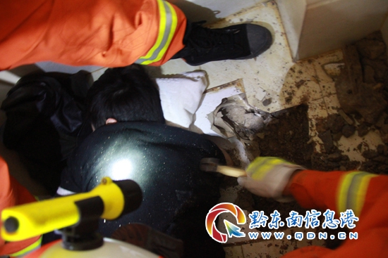 00時(shí)17分,消防官兵到達(dá)現(xiàn)場(chǎng)后,發(fā)現(xiàn)一年輕男子趴在衛(wèi)生間的地面上,右手臂卡在便池中,無(wú)法動(dòng)彈。此時(shí)該男子已被卡了近一個(gè)小時(shí),手臂已經(jīng)出現(xiàn)腫脹情況。根據(jù)現(xiàn)場(chǎng)掌握的情況,消防官兵先用浴巾墊著被卡男子頭部緩解痛苦,兩名消防官兵到二樓將便池的下水管道擊穿,將里面的水排放出。隨后,消防官兵用電動(dòng)破拆工具對(duì)便池進(jìn)行破拆,再用錘子將便池周圍一點(diǎn)一點(diǎn)鑿開,經(jīng)過(guò)大約兩個(gè)小時(shí)的努力,成功將被困男子救出。