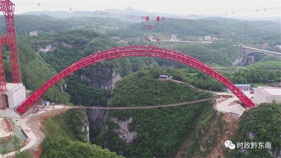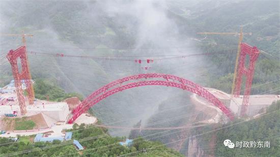 據了解,江凱河特大橋坐落于施秉縣城關鎮與甘溪鄉分界的江凱河峽谷之上,為中承式鋼管混凝土拱橋,全長259米,上部結構跨徑220米,鋼結構總重量達4452噸,拱頂距谷底地面垂直高度最高達124米。三施高速建成后可進一步帶動三穗和施秉及周邊縣市的旅游產業發展,為百姓出行、物流運輸等各項事業提供便利。(吳大康 小七)