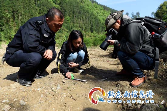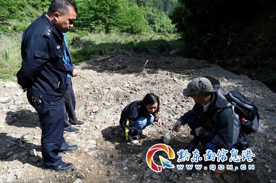 本網訊 4月17日,在臺江縣萃文街道伍寨村“噶養八略”(地名)山林河邊,貴大林學院野生動植物保護工作人員(右一)副教授張明明,前往發現大型動物腳印地區開展搜索工作。