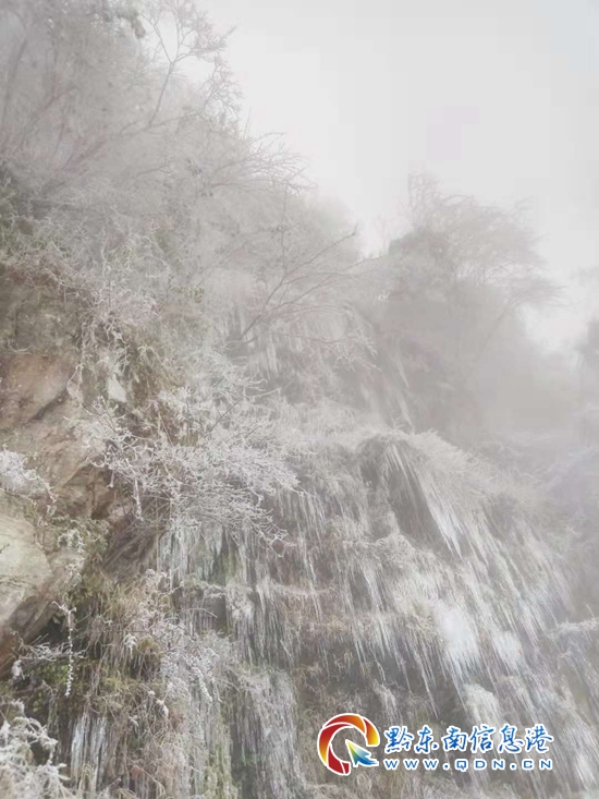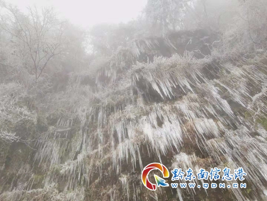 近日,受低溫天氣影響,貴州省臺江縣臺拱街道紅陽村海拔在1700米山頭的樹木草藤冰雕玉釹,被冰雪銀裝素裹,形成了一幅晶瑩如玉的冰封畫卷,引來了不少過往游客前往游玩和拍照留影。