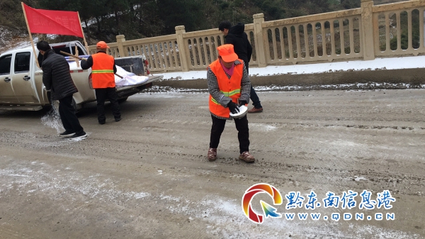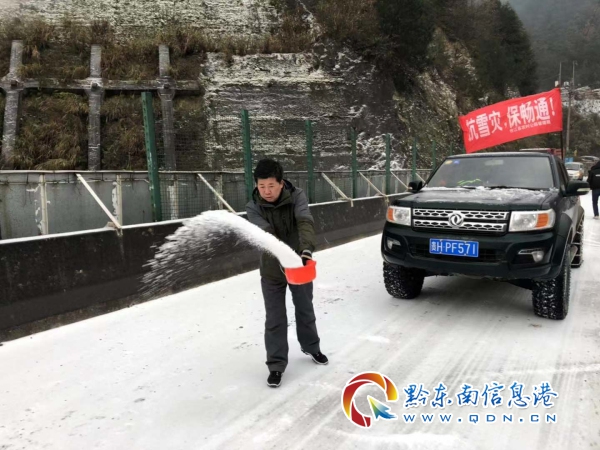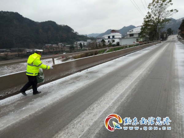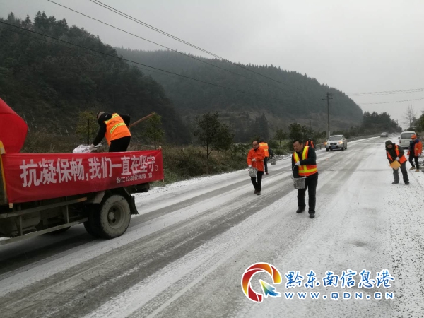 臺江至紅陽路段,臺江交警隊和環衛工人正在撒鹽除冰工作