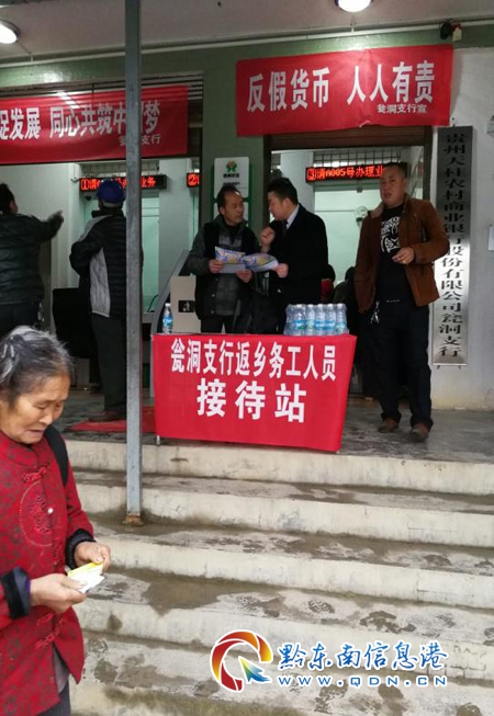 活動中,工作人員給返鄉人員倒上一杯水,進行了一聲問侯,然后介紹了我行推出的“旺旺存”定期產品、手機銀行、黔農E貸、致富通“搖錢樹”貸款卡等產品的辦理方法和操作流程。