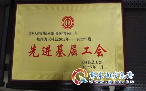 本網訊 2018年2月23日,天柱農村商業銀行工會被天柱縣總工會評為“天柱縣2012—2017年度先進基層工會”。