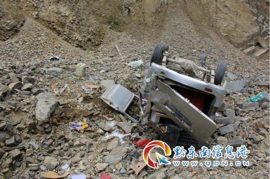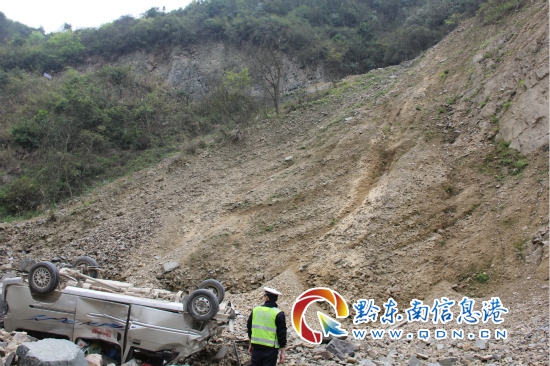 在50米外的半坡道路上,路面是砂石路面,車輛摔出路面外前,面包車已在路的右前沿被翻滾著推行42米,新建的水泥路沿有近20米的刮擦痕跡,面包車翻下處的路里坎,一輛貴JP3297 的裝載水泥高于車廂的貨車逆向停在砂石堆前。這里是天黎線36公里加700米處(小地名廖家洞),是正在改建的白市至梨木腳二級公路,路邊沒有防護裝置,路面也因該處是巖場和攪拌站而未進行改建,是施工路段。