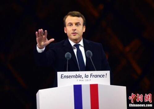 資料圖:馬克龍在巴黎盧浮宮前慶祝勝選集會上講話。中新社記者龍劍武攝