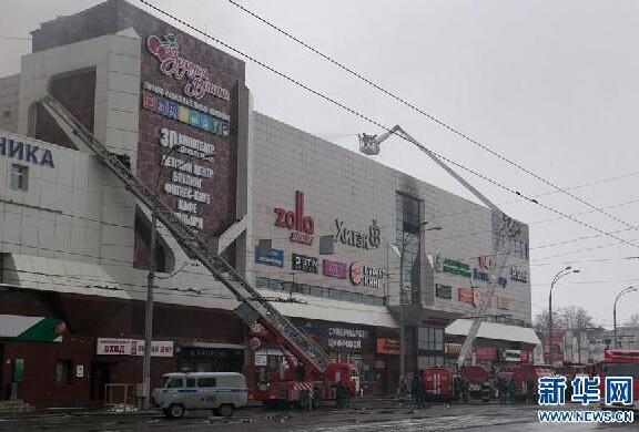 3月25日,在俄羅斯西西伯利亞南部城市克麥羅沃,消防人員在一家購物中心的火災現場滅火。新華社/衛星社