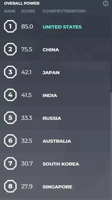 其中,美國得分85排名第一,而咱中國則以75.5分排名第二,接下來是42.1分的日本、41.5分的印度和33.3分的俄羅斯。