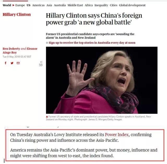 要知道,這家英國媒體可是在報道美國前國務卿希拉里訪問新西蘭時提到的這個報告,稱該報道“證明了中國的影響力確實在亞太地區迅速增加”。文章同時還提醒新西蘭人和澳大利亞人,“當心中國對你們國家的政治滲透和干涉”。(耿直哥注:話說,這新西蘭和澳大利亞這倆冷門國家到底有啥值得我們中國人“干涉”的啊……)