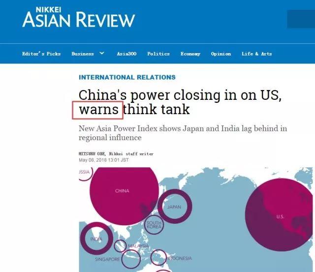 另外,日本主流媒體“日本經濟新聞”也報道了這一排名,用的標題則是“來自智庫的警告:中國的力量已經逼近美國了”。