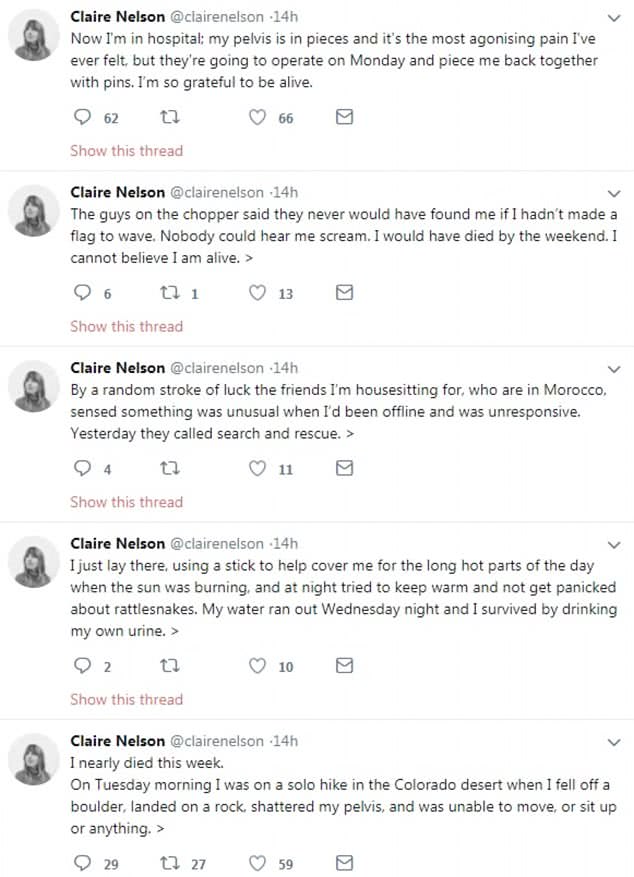 這位美女名叫克萊爾·納爾遜(Claire Nelson),5月22日早晨,克萊爾在行走中不小心從一塊巨石上滑落導致其骨盆骨折,她痛苦地坐在地上無法動彈。