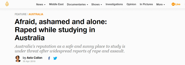 每年有將近50萬來自世界各地的留學生選擇到澳大利亞求學,其中很大一部分來自亞洲。教育已經成為澳大利亞的第三大輸出產業,每年產值達180億美元。然而,以安全和陽光明媚著稱的澳大利亞,近年卻因為頻發的強奸和性侵報道名聲大打折扣。