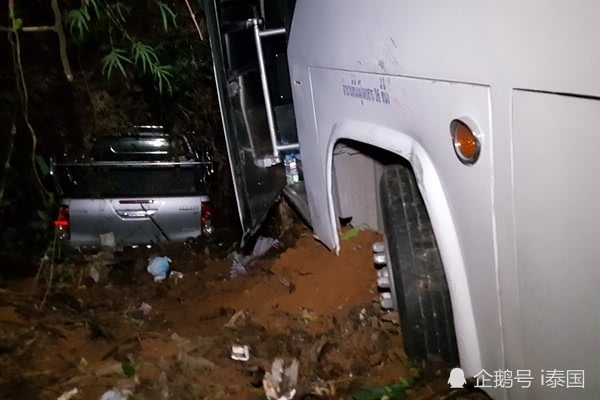 6月12日深夜11點左右,泰國普吉島卡塔山發生車禍,滿載33名中國游客的大巴車剎車失靈,將一輛皮卡車撞進路邊深坑后,所幸得香蕉林阻擋,懸在坑邊,未造成傷亡。