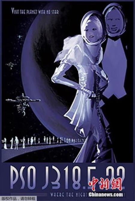 這份復(fù)古風(fēng)格的太空旅游海報(bào)中,表面暗淡一片的PSO J318.5-22,被稱(chēng)為“黑暗中的舞者”。因?yàn)樗鼘儆诠陋?dú)的漂流者,徘徊在深邃的宇宙空間之中。